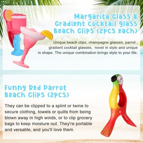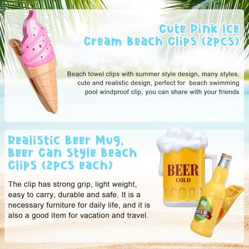 Vibrant and Funny: these beach towel clips adopt beer mug, lemon glasses, cocktail glasses, wine bottle, ice cream and parrot styles, look vibrant and funny, you can use them to clip cloths, towels or bedding