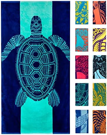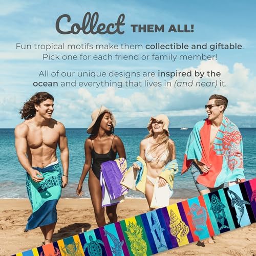 COLLECT THEM ALL – Easy to spot from a distance, our family-friendly beach towels feature bright, tropical designs inspired by our love of the ocean 🌊 Each unique towel makes a great gift 🐢 This style features a tropical turtle on bold aqua and blue stripes