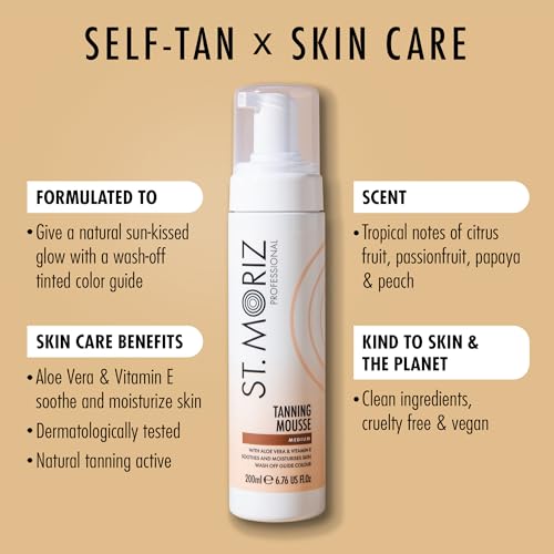 PROFESSIONAL MEDIUM TANNING MOUSSE: Say hello to a gorgeous, natural-looking tan all-year-round. St. Moriz Professional Medium Self-Tanning Mousse is perfect for creating the ultimate golden glow. Whether you’re new to self-tanning or an expert, the guide color will help you to achieve ultimate glow goals. Includes one 200ml bottle.