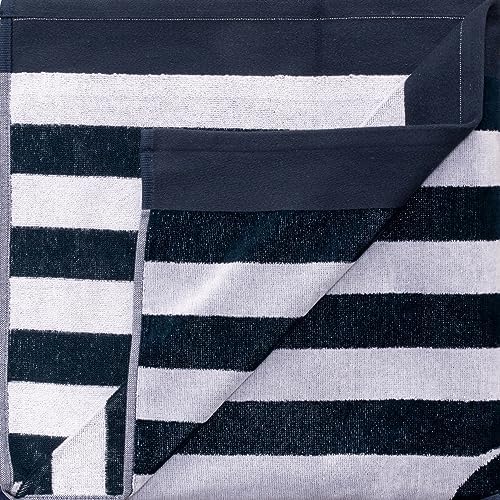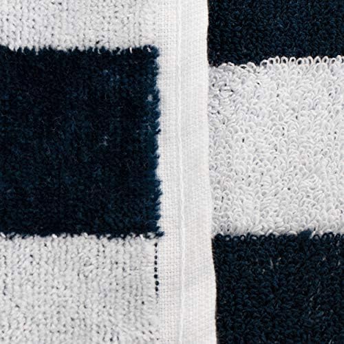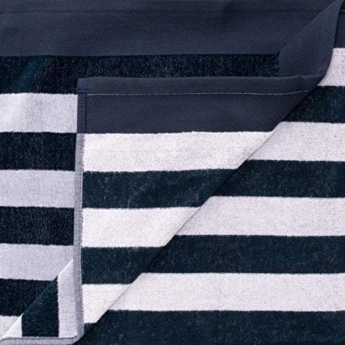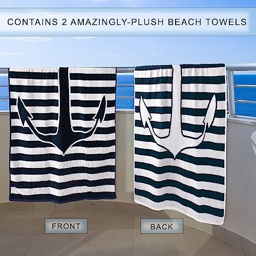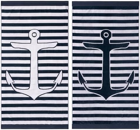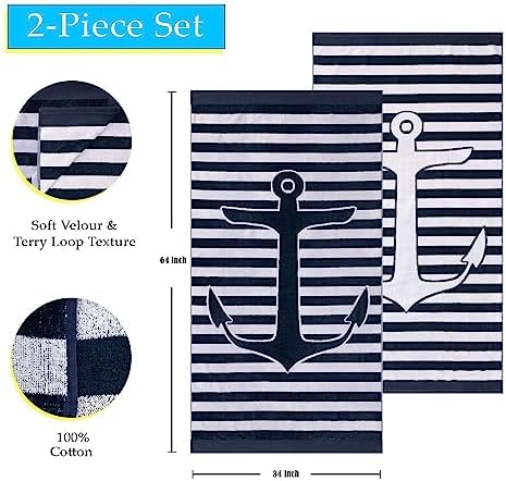 The luxurious two-piece Superior Yacht Club Cotton Oversized Beach Towel Set is the ultimate summer accessory. Boasting a large anchor design over broad navy and white stripes, these 2 towels display inverted colors of one another for a unique yet coordinated duo. An absorbent loop terry on one side and soft velour on the other help keep you warm and dry while you lounge in serenity. Expertly crafted from 100% Cotton, these towels feature a solid stitched finish on the hem. Clean flatweave edging prevents snags and unraveling, ensuring exceptional longevity for your towels. Enjoy two unique designs for one great price with our coordinating towel set.
