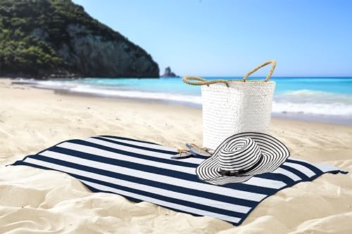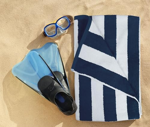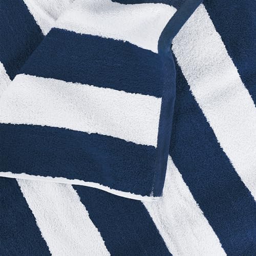 The set includes four large beach towels in cabana stripe in navy color measuring 30 by 60 inches each
